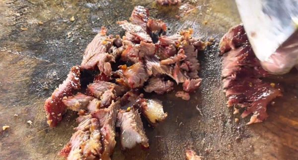 ทั้งนี้ เมื่อแล่เนื้อบางๆ จนทั่วตัวแล้ว ก็จะนำไปย่างไฟใหม่อีกประมาณครึ่งชั่วโมง กระทั่งเมื่อเนื้อภายนอกร้อนจัด ก็นำน้ำซอสที่เตรียมไว้ไปทาบริเวณผิวของเนื้อวัวให้ทั่วตัวอีกครั้ง และเมื่อได้ที่ก็ยกมาแล่เอาเนื้อส่วนบนบางๆ เสิรฟ์ ทำวนแบบนี้จนหมดทั้งตัว