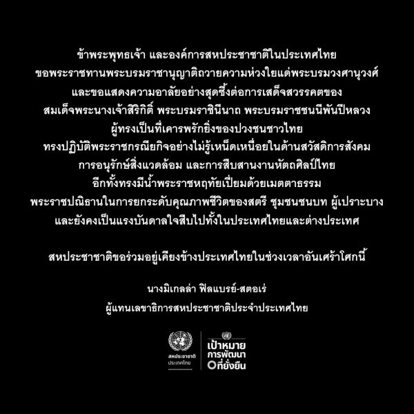 สหประชาชาติขอร่วมอยู่เคียงข้างประเทศไทยในช่วงเวลาอันเศร้าโศกนี้