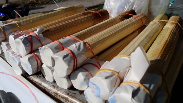 ส่วนของข้าวหลาม จะเผาในช่วงเย็น เพื่อเตรียมไว้ขายกินคู่กับปิ้งไก่ข้าวเบือ ในช่วงเช้า โดยขายในราคามัดละ 50 บาท โดย 1 มัดจะมี 4-6 กระบอก แล้วแต่ขนาดของกระบอกข้าวหลาม