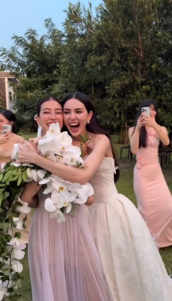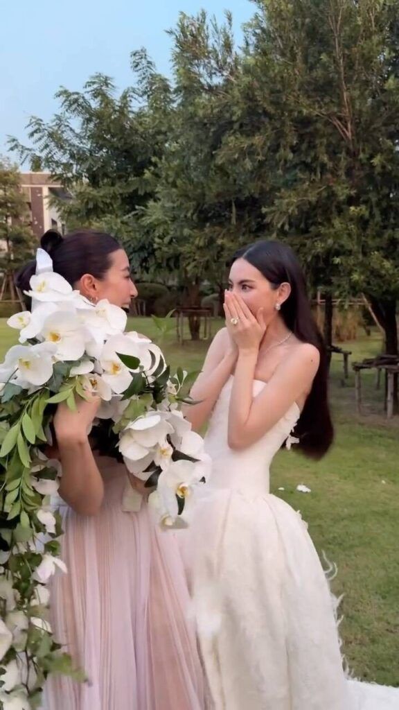 นอกจากนี้สาวใหม่ยังได้โพสต์คลิปช่วงโยนช่อดอกไม้ให้กับสาวๆ ที่มาร่วมในพิธี ซึ่งผู้โชคดีที่ได้รับช่อดอกไม้จากเจ้าสาวป้ายแดง ก็คือ เพื่อนสาวคนสนิท อย่างนางเอกสาวมิ้นต์ ชาลิดา นั่นเอง งานนี้ทำเอาสาวใหม่ออกอาการดีใจสุดๆ พร้อมแพลนกล้องไปหาหนุ่มภูผา เตชะณรงค์ แฟนหนุ่มของสาวมิ้นต์ ที่ยืนยิ้มแบบแฮปปี้อยู่ข้างๆ ขณะเดียวกันแฟนๆ ก็เข้ามาคอมเมนต์ลุ้นเชียร์ให้สาวมิ้นต์เป็นเจ้าคนต่อไปอีกด้วย