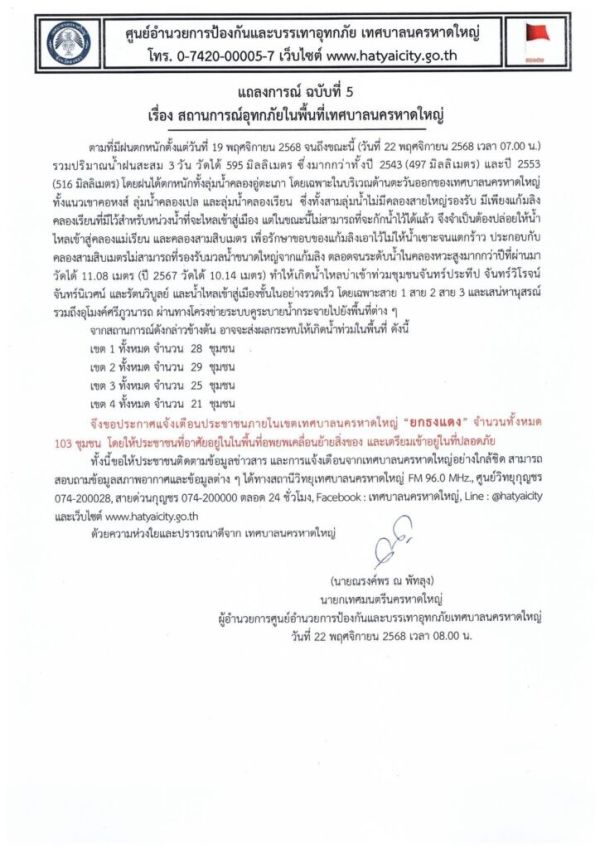 รายงานข่าวจากจังหวัดสงขลา เมื่อเวลา 08.00น. ที่ผ่านมา นายณรงค์พร ณ พัทลุง นายกเทศมนตรีนครหาดใหญ่ ผู้อำนวยการศูนย์อำนานวยการป้องกันและบรรเทาอุทกภัยเทศบาลนครใหญ่ ออกแถลงการณ์ ฉบับที่ 5 ถึงสถานการณ์อุทกภัยในพื้นที่เทศบาลนครหาดใหญ่ ระบุว่า