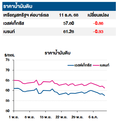 โดยราคาน้ำมันดิบเวสต์เทกซัสซื้อขายเมื่อ 11 ธ.ค. 68 อยู่ที่ 57.60 เหรียญสหรัฐต่อบาร์เรล ลดลง -0.86 เหรียญสหรัฐ และราคาน้ำมันเบรนต์อยู่ที่ 61.28 เหรียญสหรัฐต่อบาร์เรล ลดลง -0.93