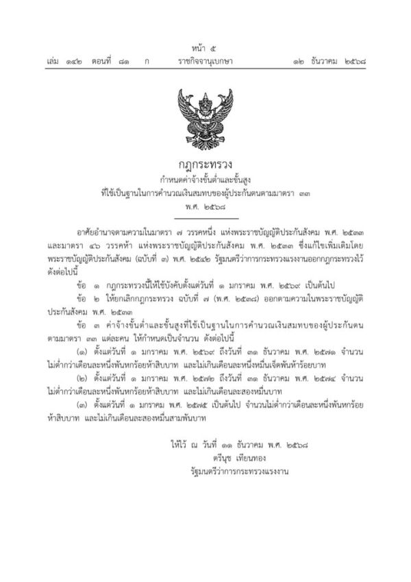 ราชกิจจานุเบกษา เผยแพร่กฎกระทรวง กำหนดค่าจ้างขั้นต่ำและขั้นสูงที่ใช้เป็นฐานในการคำนวณเงินสมทบของผู้ประกันตนตนตามมาตรา 33 พ.ศ.2568