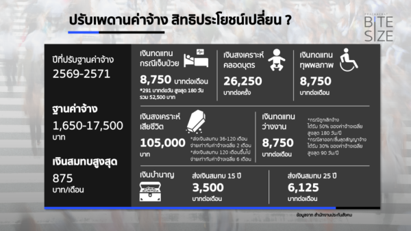 สำหรับสิทธิประโยชน์ จะมีการปรับเพิ่มขึ้นตามการปรับเพดานค่าจ้างที่ปรับขึ้นแบบขั้นบันได โดยสิทธิประโยชน์สูงสุดจะเปลี่ยนแปลงดังนี้