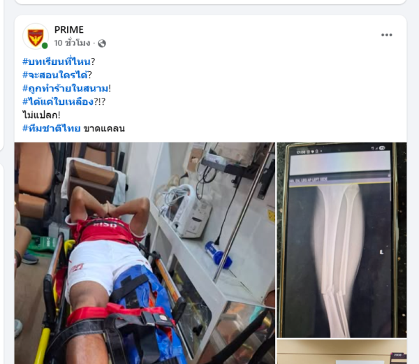 จากนั้น ทีม พราม แบงค็อก ได้โพสต์ภาพผลสแกนขาของ ไชยพฤกษ์ ปรากฏว่า ท่อนขาหัก ขณะที่เจ้าตัวยังทำใจแข็ง ยิ้มได้ พร้อมกันนี้ พราม ยังขึ้นข้อความว่า “บทเรียนที่ไหน? จะสอนใครได้? ถูกทำร้ายในสนาม! ได้แค่ใบเหลือง?!? ไม่แปลก! ทีมชาติไทย ขาดแคลน”