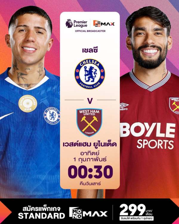 ปิดท้ายสัปดาห์ในคืน วันอังคารที่ 3 กุมภาพันธ์ 2569 เวลา 03.00 น. (คืนวันจันทร์ที่ 2 กุมภาพันธ์ 2569) Monomax ยิงสด ซันเดอร์แลนด์ พบ เบิร์นลีย์ สองทีมจากโซนล่างที่ต้องการชัยชนะเพื่อเพิ่มโอกาสอยู่รอดในพรีเมียร์ลีก ซึ่งผลการแข่งขันนัดนี้อาจส่งผลต่อสถานการณ์ระยะยาวของทั้งสองทีม