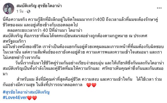 เป็นกระแสฮือฮาเมื่อ "สุรชัย สมบัติเจริญ" เปิดเผยในเฟซบุ๊ก "สมบัติเจริญ สุรชัยไดอาน่า" ถึงความรักที่ปิดไว้กว่า 40 ปี กับภรรยาที่จดทะเบียนสมรสอย่างถูกต้องตามกฎหมายกันที่อเมริกา เพราะต้องการรักษาคู่ชีวิตที่อเมริกาที่เคียงข้างกันมาตลอดเวลา
