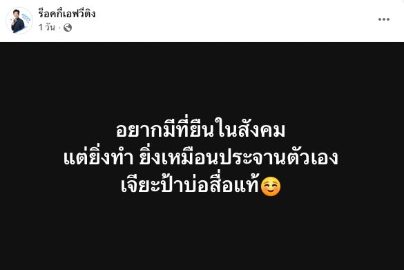 และข้อความล่าสุด ร็อคกี้ ยังโพสต์ว่า "อยากมีที่ยืนในสังคม แต่ยิ่งทำ ยิ่งเหมือนประจานตัวเอง เจียะป้าบ่อสื่อแท้" ซึ่งคำว่าเจียะป้าบ่อสื่อ เป็นสำนวนจีน แปลว่า กินอิ่มแล้วหาเรื่อง มักใช้ในบริบทตำหนิหรือล้อเล่นว่า คนๆ นั้นว่างงานเกินไปจนวุ่นวาย