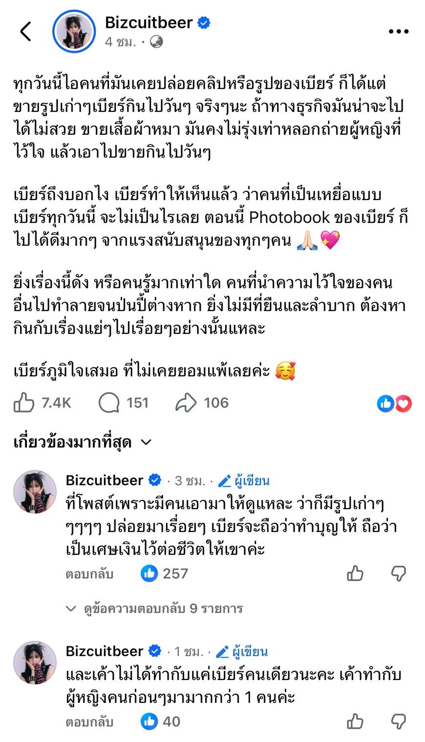 นอกจากนี้ เบียร์ ยังได้เขียนเพิ่มเติมในคอมเมนต์ว่า “ที่โพสต์เพราะมีคนเอามาให้ดูแหละ ว่าก็มีรูปเก่าๆๆๆๆๆ ปล่อยมาเรื่อย ๆ เบียร์จะถือว่าทำบุญให้ ถือว่าเป็นเศษเงินไว้ต่อชีวิตให้เขาค่ะ” และ “และเค้าไม่ได้ทำกับแค่เบียร์คนเดียวนะคะ เค้าทำกับผู้หญิงคนก่อนๆ มามากกว่า 1 คนค่ะ”.