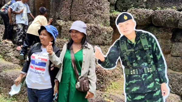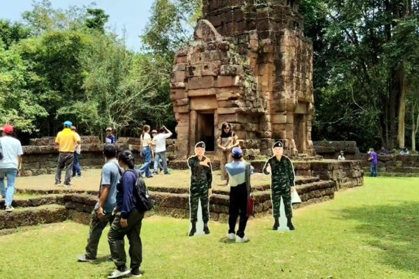 วันที่ 12 ก.ค.68 ผู้สื่อข่าวรายงานว่า ตลอดทั้งวัน ที่ปราสาทตาเมือนธม ต.ตาเมียง อ.พนมดงรัก จ.สุรินทร์ พบว่าประชาชนและนักท่องเที่ยวชาวไทยเดินทางมามอบสิ่งของให้กำลังทหารและเข้าชมปราสาทตาเมือนธม อย่างคึกคัก ทำรถติดยาวเหยียดตลอดช่วงบ่ายร่วม 3กิโลเมตร ขณะที่ประชาชนต่างมาเลี้ยงอาหาร จนท.ทหารจากหลากหลายจังหวัด อาทิ กลุ่มทำขนมพื้นบ้าน บ.ดงยาง ต.ปรือ อ.ปราสาท จ.สุรินทร์, ข้าวมันไก่ น้ำโอเลี้ยง จากชาวบ้านไทยเจริญ ต.ยางตลาด อ.ยางตลาด จ.กาฬสินธิ์ นำโดยเจ้นาง วันเพ็ญ เศรษฐรักษา รวมทั้งก๋วยเตี๋ยว และส้มตำ เป็นต้น และไม่พบว่ามีชาวกัมพูชาเข้ามาสร้างสถานการณ์ใดในวันนี้ อาจจะเป็นเพราะจำนวนคนไทยที่มีมากกว่า จึงไม่กล้าเข้ามาป่วน โดยพบข้อมูลของ นทท.ชาวไทยที่เข้ามาเที่ยวเมื่อวานนี้ จำนวน 5,914 คน ส่วน ชาวกัมพูชา เข้ามาเพียง 582 คนเท่านั้น และวันนี้พบตัวเลข นทท.ไทยเข้ามาจำนวน 6,266 คน ชาวกัมพูช จำนวน 1,292 คน ซึ่งคาดว่าจะมี นทท.ไทยเข้ามาจำนวนมากอีกวันหยุดยาวในวันพรุ่งนี้