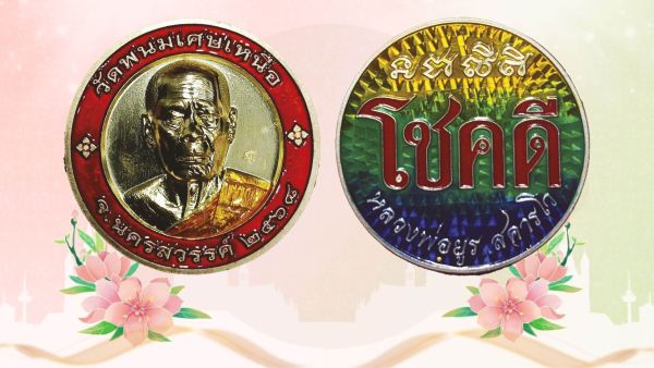 จัดสร้างหลายเนื้อ อาทิ เนื้อเงิน หน้ากากทองคำโชคดี ลงยาพื้นแดง-น้ำเงิน-เขียว (หลังหลวงพ่อ) 21 เหรียญ, เนื้อเงิน หน้ากากทองคำโชคดี ลงยาพื้นฟ้า (หลังนางกวัก) 27 เหรียญ, เนื้อเงิน ลงยาพื้นฟ้า ลงยาโชคดีไล่เฉด หลังลงยาพื้นฟ้า ขอบแดง จีวร (หลังหลวงพ่อ) 35 เหรียญ, เนื้อเงินลงยาพื้นชมพู ลงยาโชคดีไล่เฉด ขอบฟ้า (หลังนางกวัก) 15 เหรียญ,