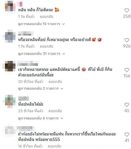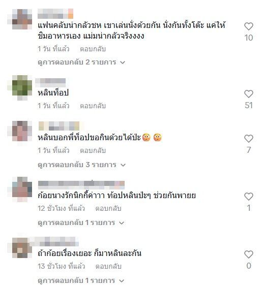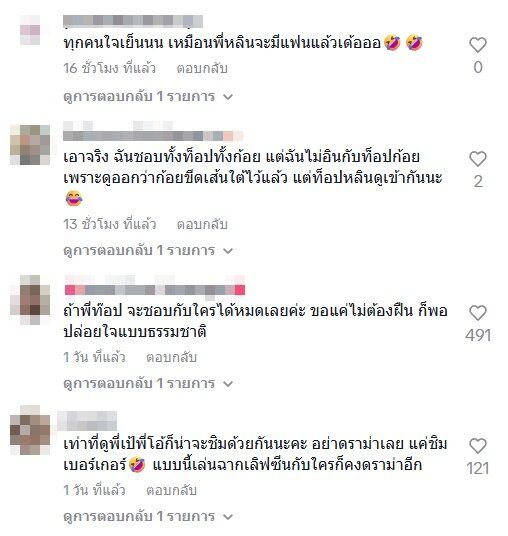 ซึ่งในคลิป หลิน ก็ได้พูดกับ ท็อป ว่า “พี่ท็อปขอกินด้วยได้ป่าว” ก่อน ท็อป จะยื่นเบอร์เกอร์ป้อนให้ หลิน ทำเอากลายเป็นดราม่า คอมเมนต์โยงถึง ก้อย อรัชพร ที่ดราม่าไปลงที่หลินบ้าง หรือหมดหวังกับ ก้อยท็อป บ้าง หลายคนก็บอกว่า หลินท็อป ก็ไม่ติด บ้างก็บอกจะไม่ให้เขามีเพื่อนเลยเหรอ อาทิ