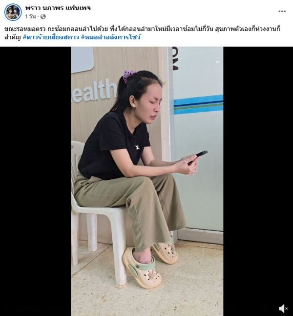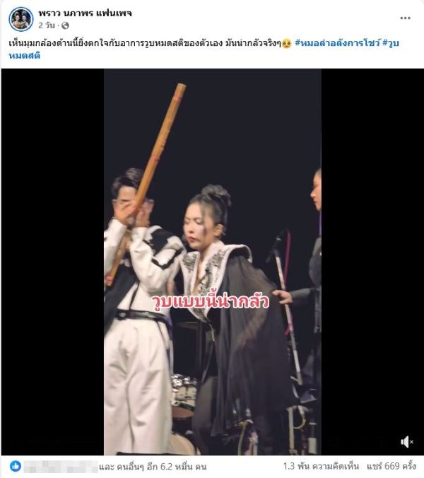 พราว นภาพร แฟนเพจ โพสต์คลิปขณะหมอลำสาวขณะจู่ๆเกิดอาการวูบใช้มือเกาะทีมงานแล้วทรุดลงไปที่พื้น ทีมงานต้องเข้าช่วย ข้อความ “วูบแบบนี้น่ากลัว”