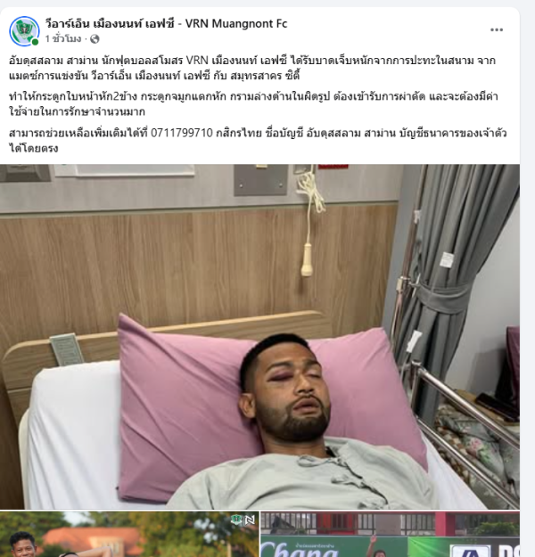 บอลถ้วยไทยลีก 3 ปะทะแรง "อัลดุลสลาม สาม่าน" นักเตะวีอาร์เอ็น เมืองนนท์ เจ็บหนัก กระดูกใบหน้าหัก 2 ข้าง กระดูกจมูกแตกหัก กรามล่างด้านในผิดรูป ต้องผ่าตัด ต้นสังกัดเผยต้องใช้ค่ารักษาจำนวนมาก เปิดบัญชีบริจาคตรงให้นักเตะ