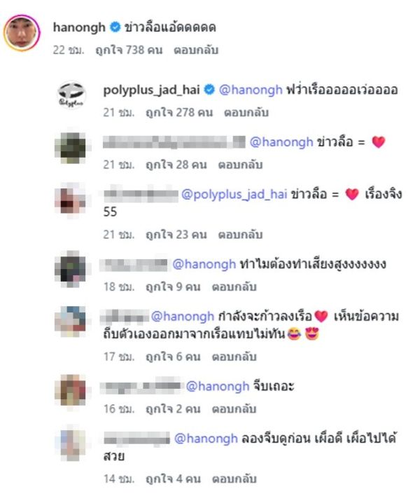 ขณะที่ หน่อง ก็มาคอมเมนต์ในโพสต์ดังกล่าวถึงแอดมิน โดยตอบแบบลักษณะเสียงสูงด้วยว่า “ข่าวลือแอ้ดดดดด” ท่ามกลางคอมเมนต์ก็ยังคงเข้ามาเชียร์กับคำตอบว่า ข่าวลือ ของหน่อง บ้างก็บอก ข่าวลือเท่ากับอิโมจิหัวใจ บ้างก็บอกเท่ากับเรื่องจริง บ้างก็บอกว่า ทำไมต้องทำเสียงสูงงงงงงง เป็นต้น