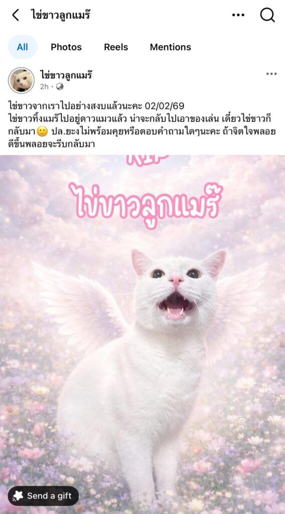 โลกออนไลน์ร่วมแสดงความอาลัย หลังเพจ “ไข่ขาวลูกแมร๊” อินฟลูเอนเซอร์-พรีเซ็นเตอร์ชื่อดัง โพสต์แจ้งข่าวการจากไปของ “ไข่ขาว” แมวแสนรักของครอบครัว เมื่อวันที่ 2 กุมภาพันธ์ 2569 โดยระบุว่า ไข่ขาวได้จากไปอย่างสงบ และขณะนี้ได้ “ไปอยู่ดาวแมวแล้ว”
