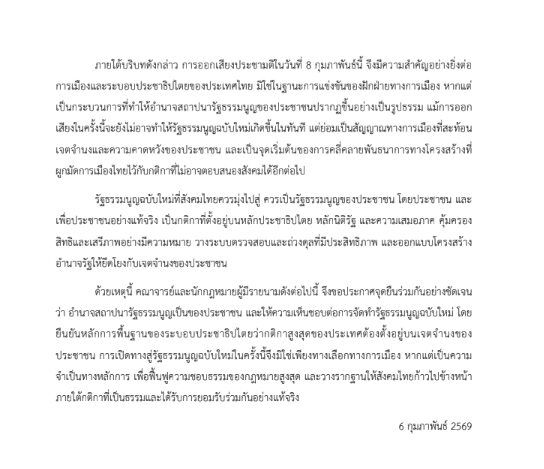 ด้วยเหตุนี้ คณาจารย์และนักกฎหมาย จึงขอประกาศจุดยืนร่วมกันอย่างชัดเจน ว่า อํานาจสถาปนารัฐธรรมนูญเป็นของประชาชน และให้ความเห็นชอบต่อการจัดทํารัฐธรรมนูญฉบับใหม่ โดยยืนยันหลักการพื้นฐานของระบอบประชาธิปไตย ว่า กติกาสูงสุดของประเทศต้องตั้งอยู่บนเจตจํานงของประชาชน