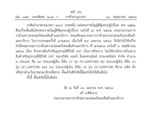 วันที่ 31 พ.ค.2568 ผู้สื่อข่าวรายงานว่า เว็บไซต์ ราชกิจจานุเบกษา ได้เผยแพร่ คำสั่งคณะกรรมการว่าด้วยความปลอดภัยของสินค้าและบริการ ที่ 14/2568 เรื่อง ยกเลิกการห้ามขายสินค้าหรืออุปกรณ์ที่มีรังสี UVC ของบริษัท แอลจี อีเลคทรอนิคส์ (ประเทศไทย) จำกัด จำนวน 3 ประเภท ได้แก่